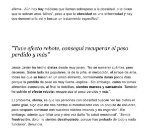 Jesús Javier ha hecho dietas desde muy joven. “No sé numerar cuántas, pero decenas. Sobre todo las populares, la de la piña, el melocotón, el sirope de arce, todas las que se basan en un único alimento, normalmente duran pocos días porque la pérdida de peso es muy fuerte -explica-. Sin embargo, como no tomas alimentos esenciales, al final te debilitas, sientes mareos y cansancio. También he sufrido el efecto rebote: recuperaba el peso perdido y más”.