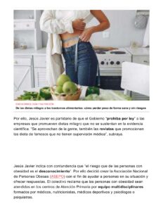Por ello, Jesús Javier es partidario de que el Gobierno “prohíba por ley” a las empresas que promueven dietas milagro que no se sustentan en la evidencia científica. “Se aprovechan de la gente, también las revistas que promocionan las dieta de famosos que no tienen supervisión médica”, subraya.