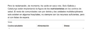 Pero la reclamación, de momento, ha caído en saco roto. Solo Galicia y Catalunya están implantando la figura de los nutricionistas en los centros de salud. El resto de comunidades van por detrás y las unidades multidisciplinares solo existen en algunos hospitales, no siempre con los recursos suficientes, pero sí con listas de espera.